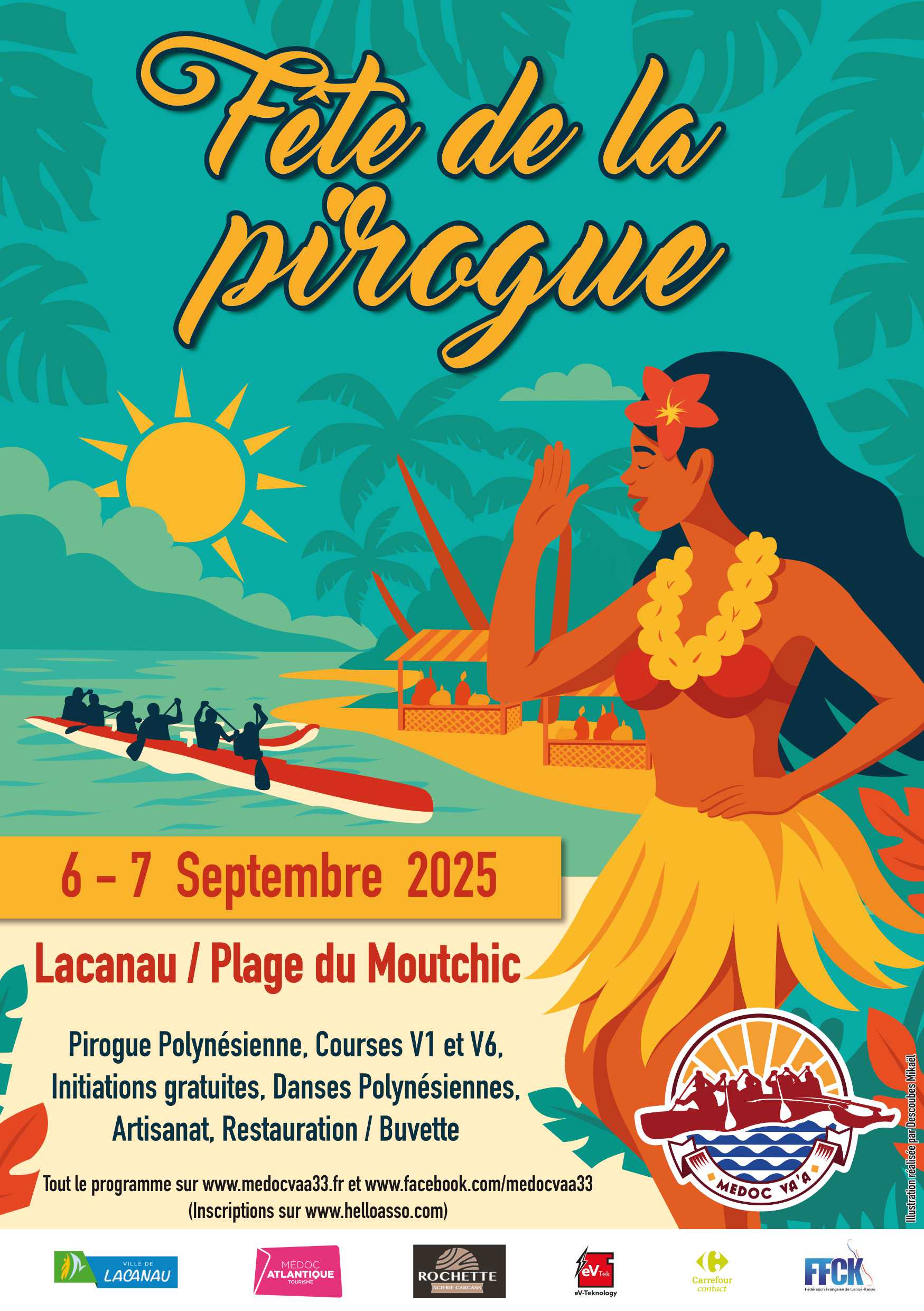 Durant le WE du 06 et 07 septembre 2025, vous voyagerez avec nous en Polynésie à travers notre festival proposant : Pirogue Polynésienne, Courses V1 et V6, Initiations gratuites, Danses Polynésiennes, Artisanat, Restauration / Buvette